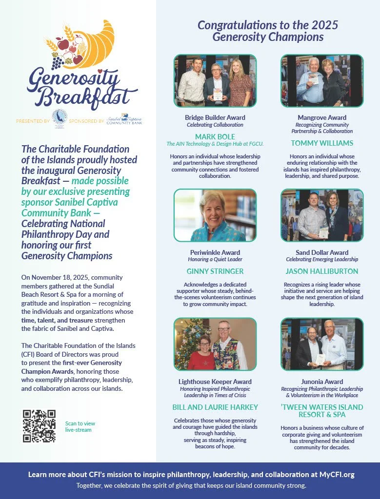 The Charitable Foundation of the Islands is a public grant-making charity serving the Islands of Sanibel and Captiva (SWFL) as described in Section 501(c)3 of the Internal Revenue Code (EIN # 27-4027791).