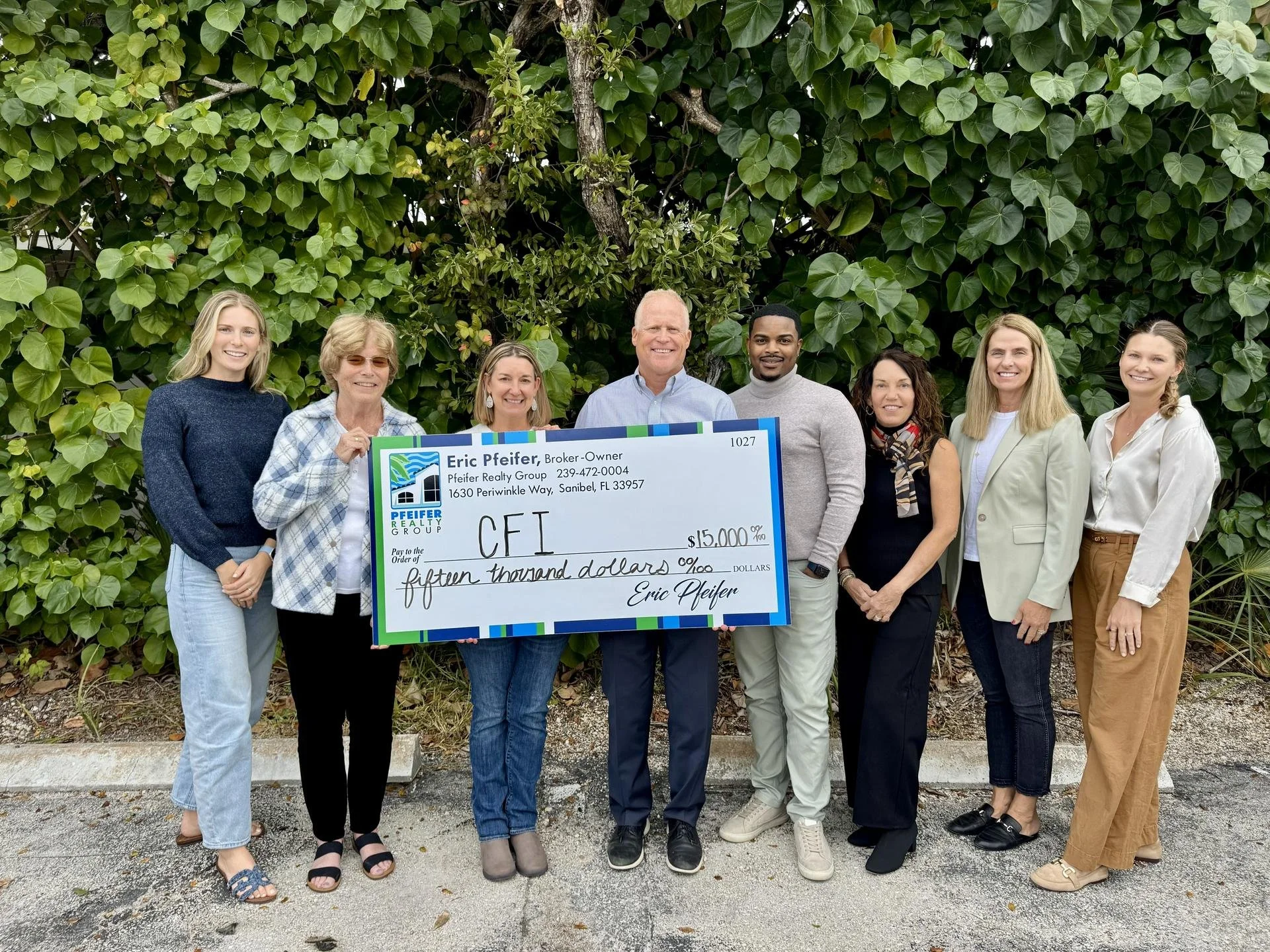 From left: Savannah Kelly, CFI Director of Community Engagement; Lisa Riordan, CFI Board Chair; Dolly Farrell, CFI Executive Director; Eric Pfeifer, Broker at Pfeifer Realty Group and CFI Board Member; Marvell Bradley, Pfeifer Realty Group Agent and CFI Leadership Alum, Class of 2024; Mary Ellen Pfeifer, Marketing Director, Pfeifer Realty Group; Allison Goss, Pfeifer Realty Group; and Savannah Smith, Marketing Manager, Pfeifer Realty Group.
